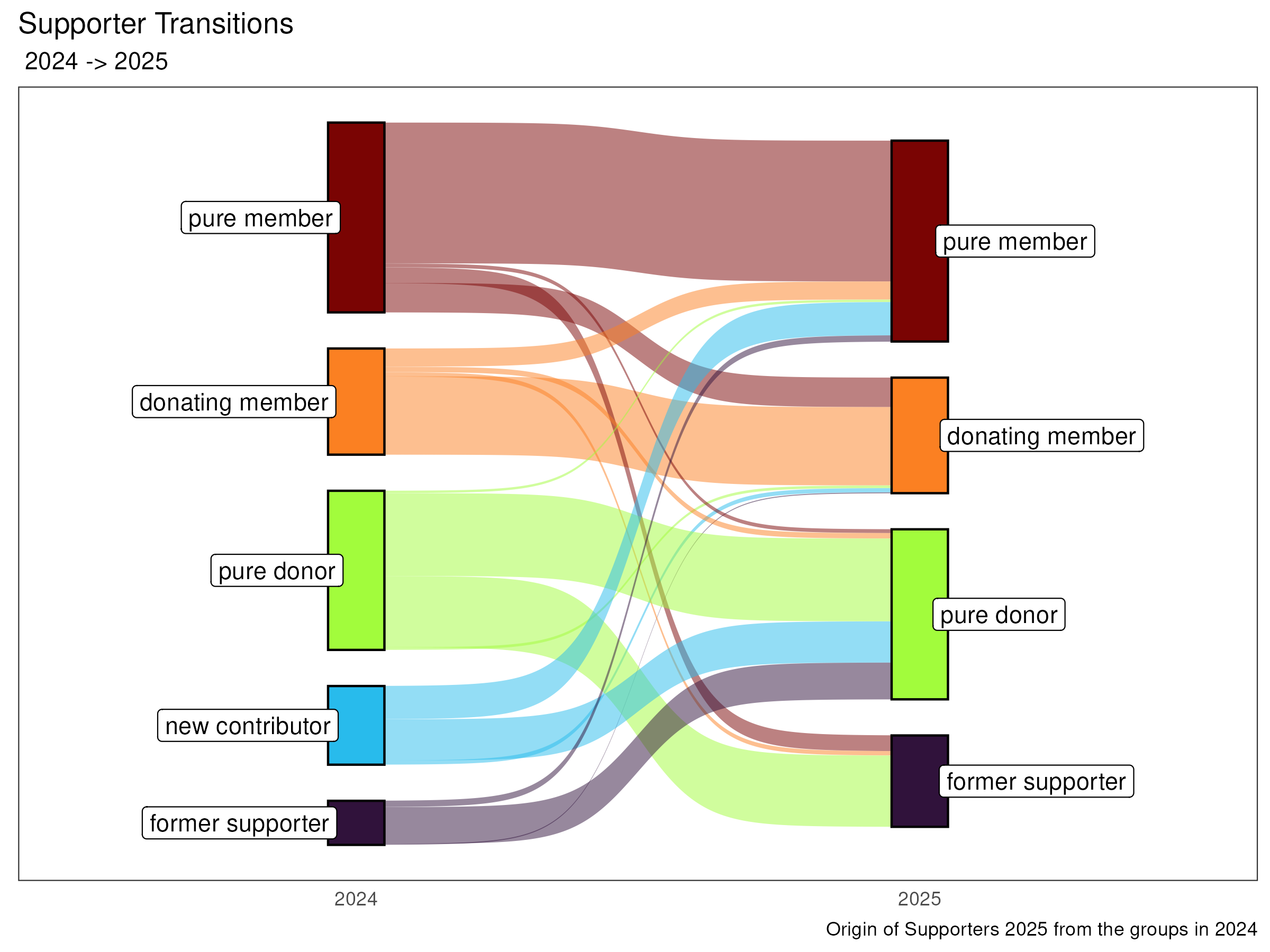 The graph shows the flow of individual supporters from one group in 2023 to the next in 2024. It is part of the automatically generated annual report and is created directly from the fundraising database. (In this case, fictitious data for Trees4Teuto, but this has already been implemented for other databases.)